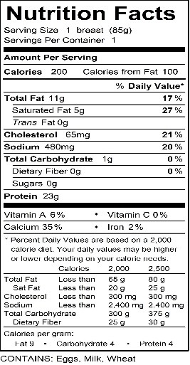 | Ingredients | Chicken Breast (contains up to 5% retained water), Crust (Parmesan Cheese (Pasteurized Part Skim Cow’s Milk, Cheese Cultures, Salt, Enzymes), White Bread (Unbleached Wheat Flour Enriched (Wheat Flour, Malted Barley Flour, Niacin, Reduced Iron, Thiamine, Mononitrate, Riboflavin, Folic Acid), Wheat Gluten, GMO Free Palm Oil, Sugar, Salt, Vinegar, Natural Enzyme, Yeast), Whole Eggs, Enriched Unbleached Wheat Flour (Wheat Flour, Malted Barley Flour, Niacin, Iron, Thiamine Mononitrate, Riboflavin, Folic Acid), Seasoning, Salt |