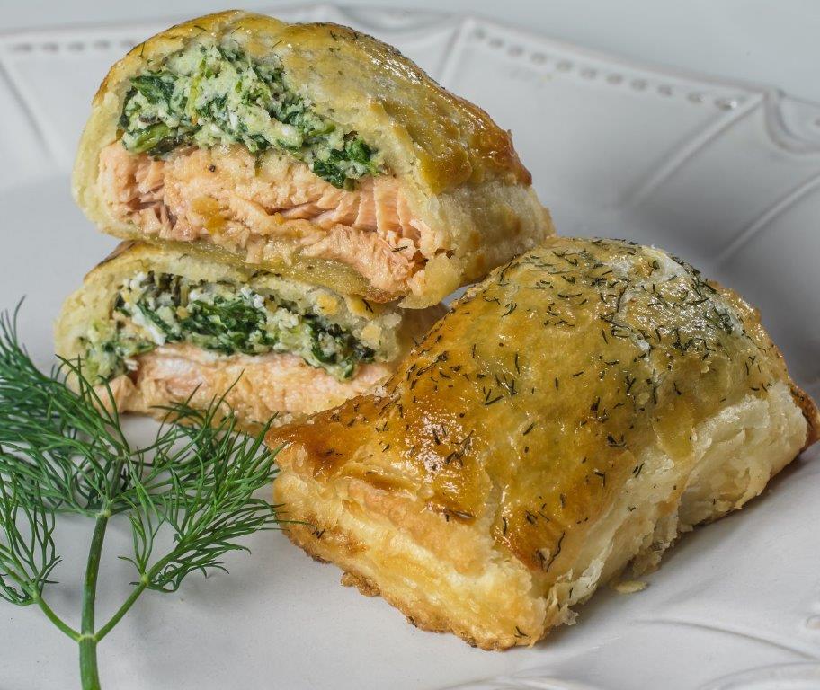 A lighter version of the classic Beef Wellington, featuring Atlantic salmon topped with spinach, onion, and feta cheese and wrapped in decadent puff pastry dough.