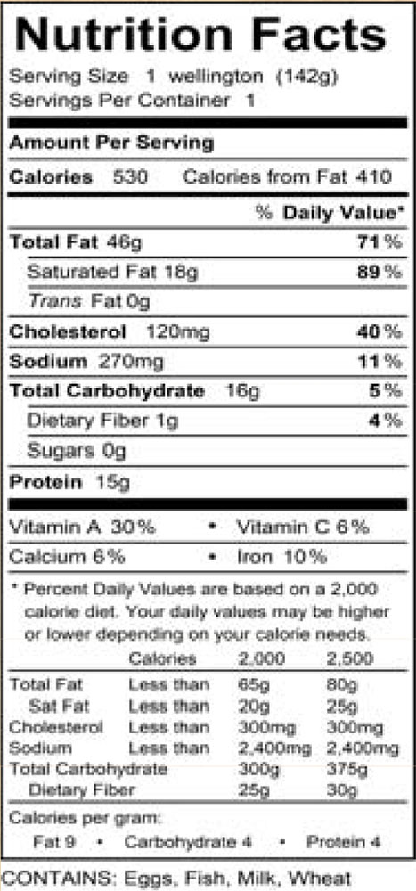 | Ingredients | Salmon (Salmon, Salt, Seasoning), Filling: (Spinach, Onion, Cream Cheese (Pasteurized Milk, Cheese Cultures, Salt, Stabilizers (Carob Bean and or Xanthan Gum and or Guar Gums), Feta Cheese (Pasteurized Milk, Cheese Cultures, Salt, Enzymes), Parmesan Cheese (Pasteurized Part Skim Cow’s Milk, Cheese Cultures, Salt, Enzymes), Garlic, Salt, Seasoning), Puff Pastry (Enriched Unbleached Wheat Flour (Wheat Flour, Malted Barley Flour, Niacin, Iron, Thiamine Mononitrate, Riboflavin, Folic Acid), Water, Butter (Cream), Salt), Whole Egg, Dill Weed |