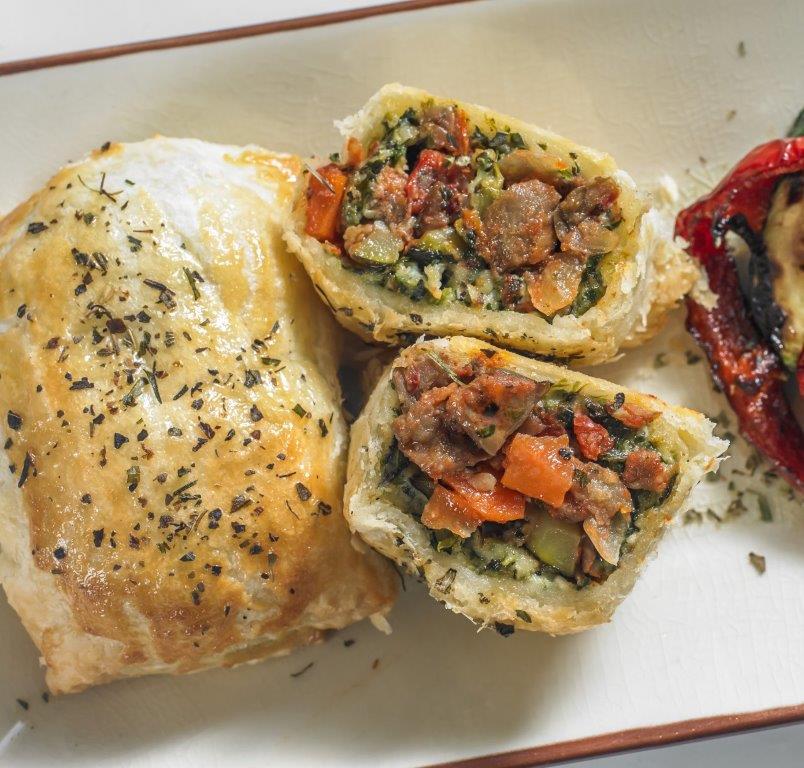 We’ve reinterpreted the classic British Beef Wellington with our tantalizing Vegetarian Wellington. We start with a slow-cooked ratatouille, featuring eggplant, red bell peppers, yellow squash, zucchini, carrots, and onions. A tangy spinach and feta mixture tops the ratatouille, which is then wrapped in our buttery puff pastry. A savory Mediterranean herb blend is brushed on top of each pastry, adding a tantalizing layer of flavor to the dish. All you have to do is heat and serve!