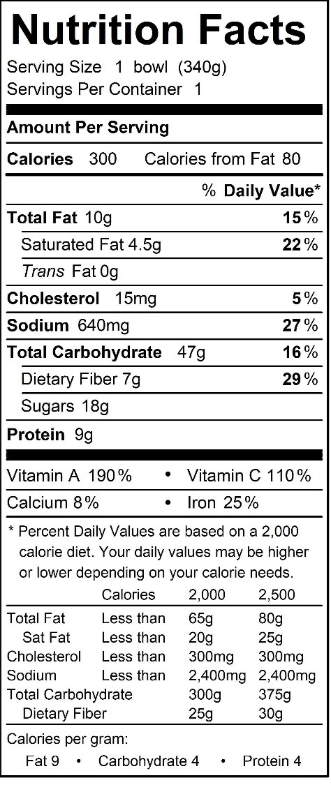 | Ingredients | Sweet Potato, Hominy Beans, Yellow Corn, Red Bell Pepper, Sauce (Chicken Stock(Water, |