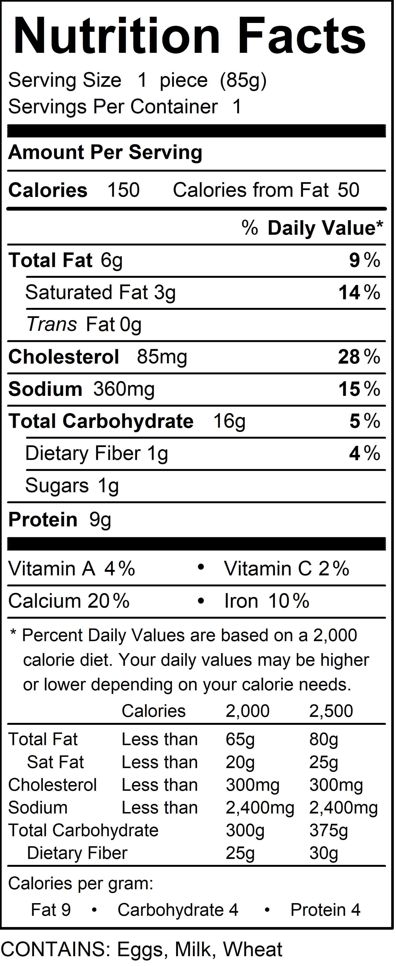 | Ingredients | Rice Mixture (Water, Arborio Rice, Mozzarella Cheese (Pasteurized Milk, Cheese Cultures, Salt, Enzymes), Parmesan Cheese (Pasteurized Part Skim Milk Cow Milk, Cheese Cultures, Salt, Enzymes, Powdered Cellulose added to Prevent Caking), Onion, Butter (Cream), Parsley, Seasoning, Salt) Filling: Marinara Sauce (Vine Ripened Fresh Tomatoes, a blend of extra Virgin Olive Oil, and Sunflower Oil, Salt, Onions, Sugar, Black Peppers, Basil, Oregano, Parsley and Naturally Derived Citric Acid), Breadcrumbs (Unbleached Wheat Flour Enriched (Wheat Flour, Malted Barley Flour, Niacin, Reduced Iron, Thiamine, Mononitrate, Riboflavin, Folic Acid), Wheat Gluten, GMO Free Palm Oil, Sugar, Salt, Vinegar, Natural Enzyme, Yeast), Mozzarella Cheese (Pasteurized Milk, Cheese Cultures, Salt, Enzymes), Crust: Whole Egg, Breadcrumbs (Unbleached Wheat Flour Enriched (Wheat Flour, Malted Barley Flour, Niacin, Reduced Iron, Thiamine, Mononitrate, Riboflavin, Folic Acid), Wheat Gluten, GMO Free Palm Oil, Sugar, Salt, Vinegar, Natural Enzyme, Yeast), Enriched Unbleached Wheat Flour (Wheat Flour, Malted Barley Flour, Niacin, Iron, Thiamine Mononitrate, Riboflavin, Folic Acid), Parsley, Seasoning, Canola Oil |