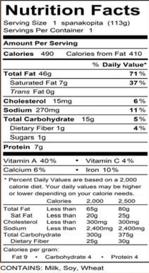 | Ingredients | Filling: (Spinach, Onion, Cream Cheese (Pasteurized Milk, Cheese Cultures, Salt, Stabilizers (Carob Bean and or Xanthan Gum and or Guar Gums), Feta Cheese (Pasteurized Milk, Cheese Cultures, Salt, Enzymes), Parmesan Cheese (Pasteurized Part Skim Cow’s Milk, Cheese Cultures, Salt, Enzymes), Garlic, Salt, Seasoning), Filo Dough (Enriched Unbromated Unbleached Wheat Flour (Malted Barley Flour, Iron, Niacin, Thiamine Mononitrate, Riboflavin, Folic Acid), Water, Arrowroot, Soybean Oil, Salt), 3-Oil Blend (Vegetable Oil (Canola, Sunflower, Soybean), Soy Lecithin, Natural Flavor, Beta Carotene (Color) and Propellant) |