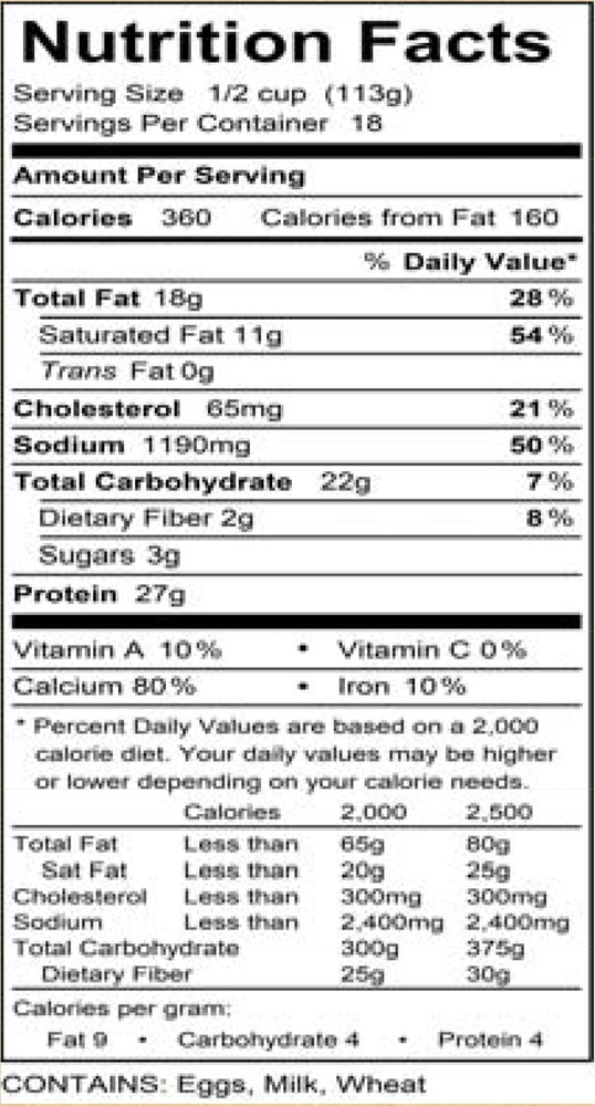 | Customer Heating Directions | Baking Directions from frozen. Remove the plastic film and cover in foil. Preheat an oven to 375F and heat for 90 minutes. Remove the foil for the last 20 minutes of heating. An internal temperature of 158F must be reached. Appliances vary, adjust accordingly. Should the item need more heating time, simply allow a few minutes extra. |