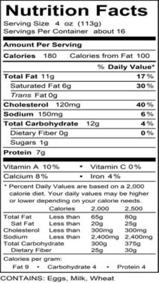 | Ingredients | Sauce (Sour Cream (Cultured Cream), Whole Egg, Ricotta Cheese (Sweet Whey, Whole Milk, Sweet Cream, Culture, Vinegar, Salt), Cream Cheese (Pasteurized Milk and Cream Cheese Cultures, Salt, Stabilizers (Carob Bean and/or Xanthan and/or Guar Gums), Sugar, Butter (Cream), Vanilla Extract, Salt), Egg Noodle (Durum Flour (Wheat), Egg Yolks or Egg, Niacin, Iron, Thiamine Mononitrate, Riboflavin, Folic Acid), Golden Raisins (Raisins, Water) |