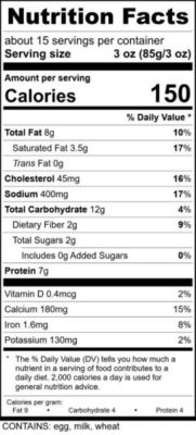 | Ingredents | (Milk (Grade A Reduced Fat Milk, Vitamin A Palmitate, Vitamin D3), Whole Eggs, White Bread (Unbleached Wheat Flour Enriched (Wheat Flour, Malted Barley Flour, Niacin, Reduced Iron, Thiamine, Mononitrate, Riboflavin, Folic Acid), Wheat Gluten, GMO Free Palm Oil, Sugar, Salt, Vinegar, Natural Enzyme, Yeast), Cheddar Cheese (Pasteurized Milk, Cheese Cultures, Salt, Enzymes), Sausage (Pork, Water, Salt, Spices, Sugar, Caramel Color, Natural Flavor), Green Onion, Seasoning, Salt) |